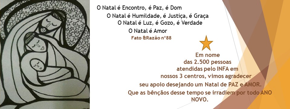 Em nome das 2.500 pessoas atendidas pelo INFA em nossos 3 centros, vimos agradecer seu apoio desejando um Natal de PAZ e AMOR. Que as bênçãos desse tempo se irradiem por todo ANO NOVO.